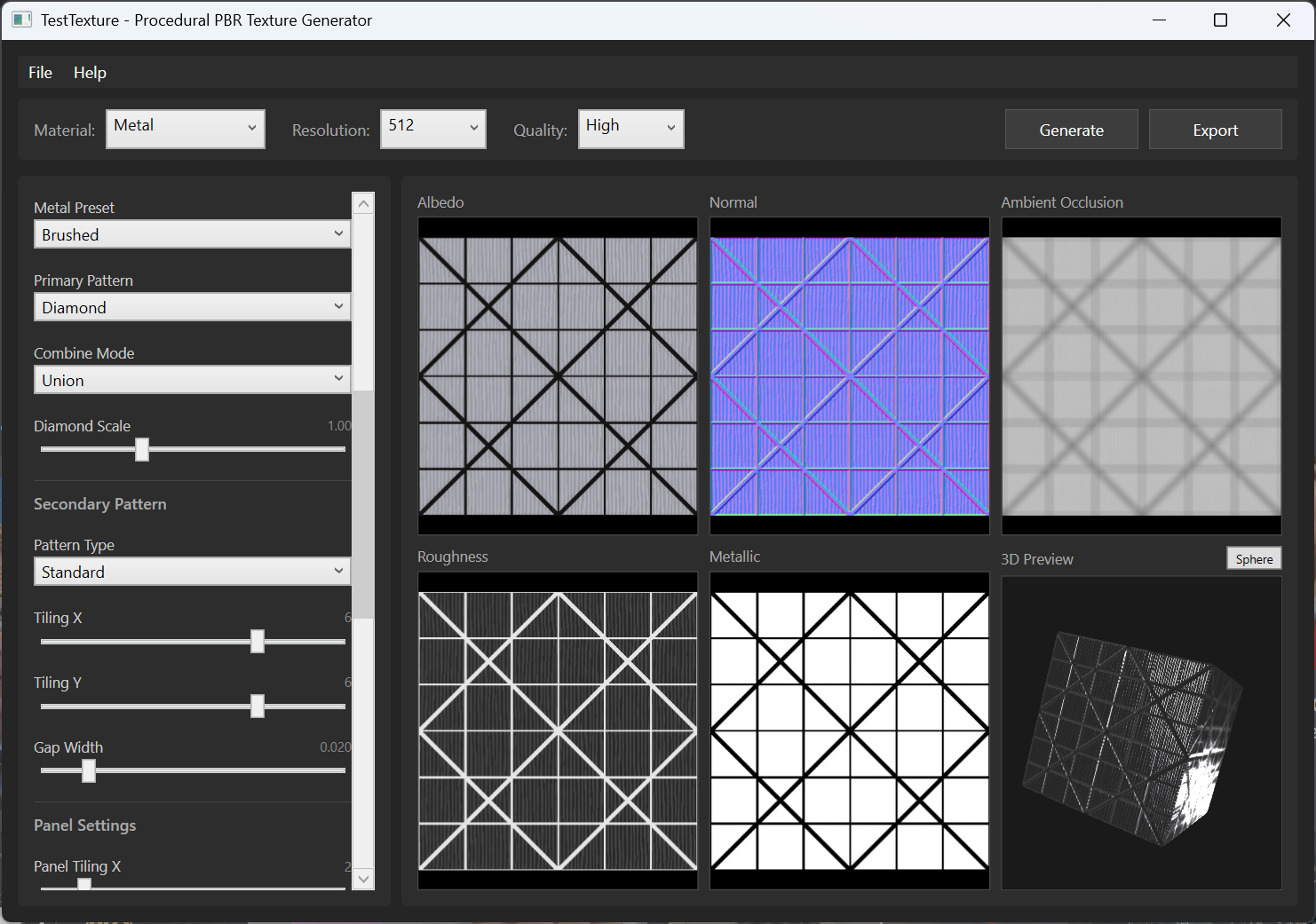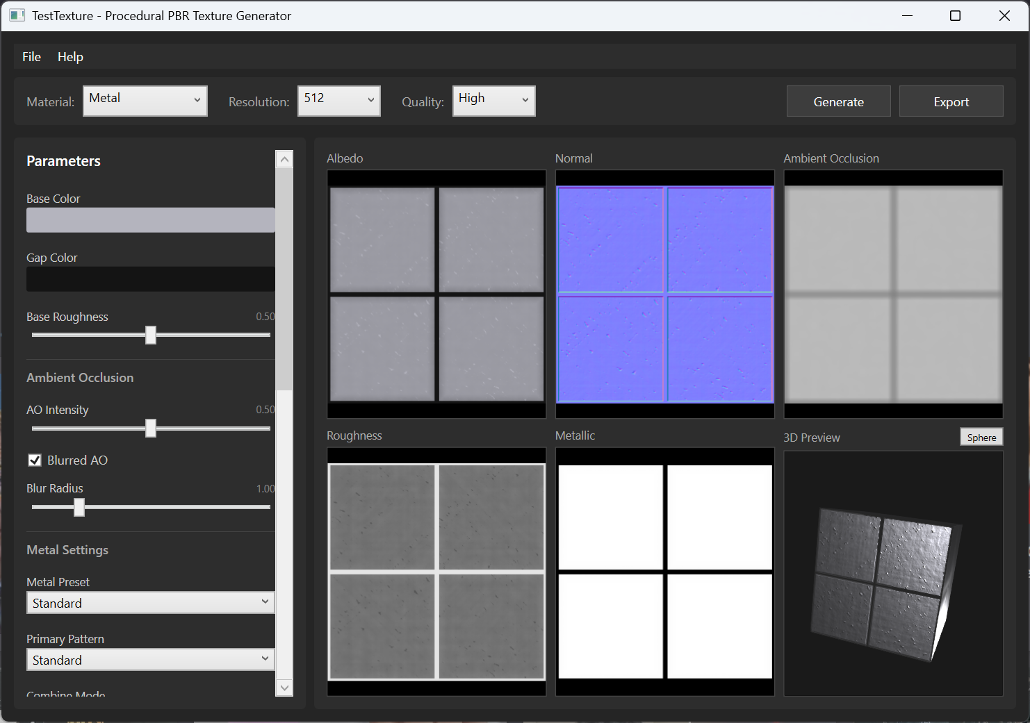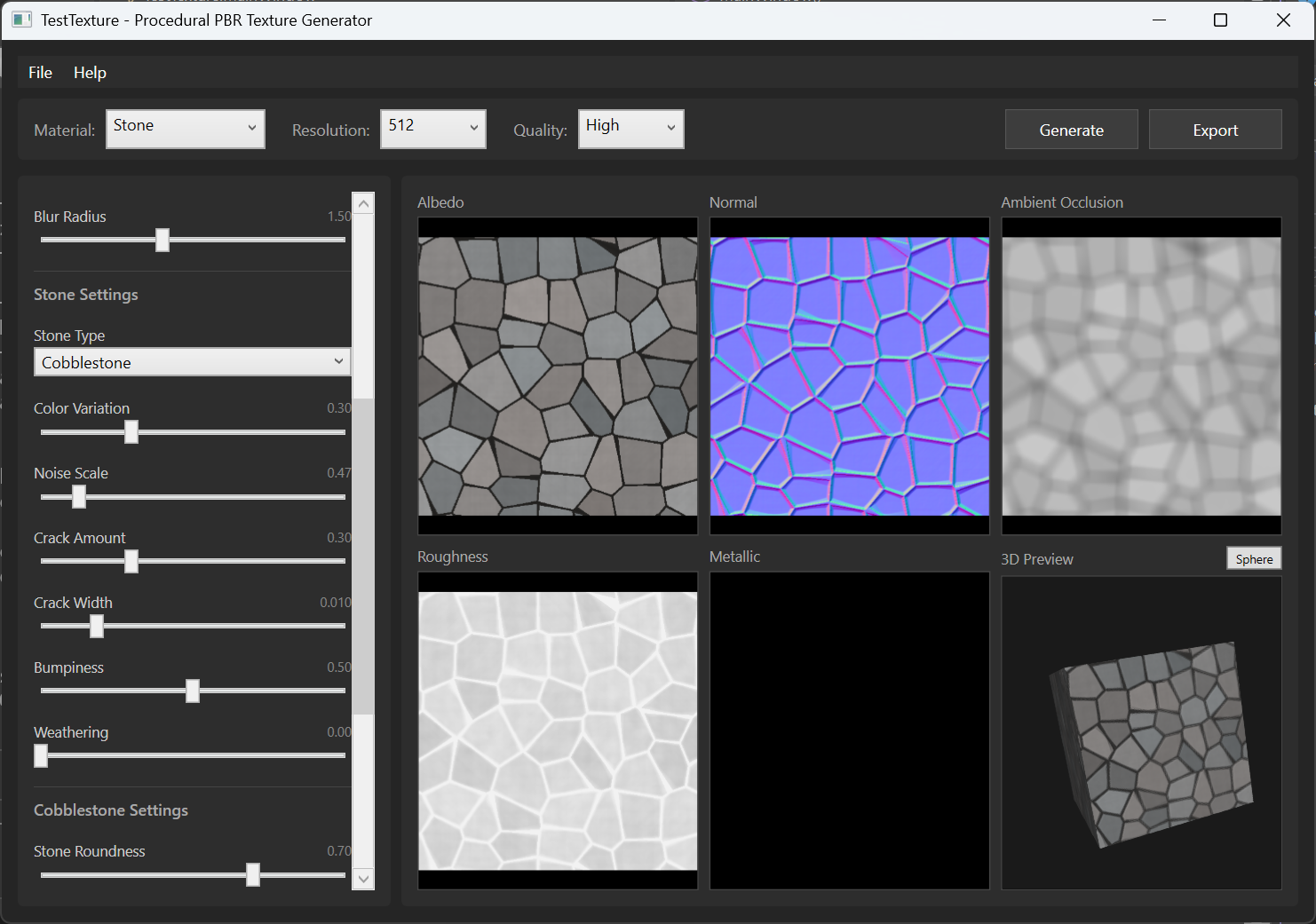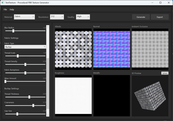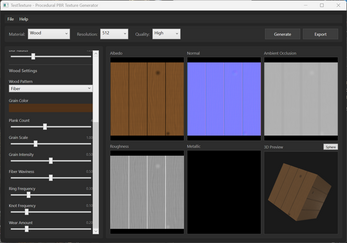 I built this because I wanted a quick way to generate PBR textures for my own game engine without firing up Substance or hunting through asset libraries. Pick a material, tweak some sliders, preview on a 3D cube, export your maps. That's it.